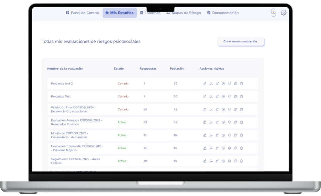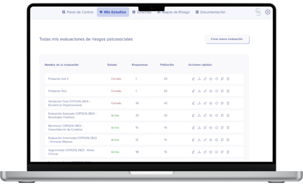 RPS360 es una plataforma SaaS que digitaliza protocolos científicos reconocidos, como COPSOQ, y los transforma en información clara, accionable y útil para la toma de decisiones preventivas.